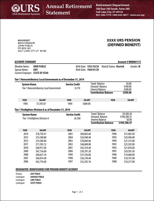 This shows the retirement system(s) in which members have service credit and the amount of service credited to their retirement accounts. Transactions are listed for each employer, showing the earnings reported to URS for each year. Only the base salary should be reported for members of the Firefighters and Public Safety systems, because only base salary is used to calculate retirement benefits for these systems. Member total service credit is reflected on the annual statement. Salary prior to 1980 may not be listed.